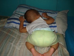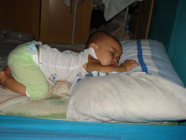 Her routine won’t be complete without rolling or turning 360 degrees. As in sobrang gulo niya dahil naghahanap ng pwesto. Nililibot niya ang kama. So what we usually do is to lock her in certain space (between namin pa rin) para dun lang sya magiiikot. At hindi sya makakatulog without tapping her leg or legs. So minsan pag nakakatulugan namin sya at gising pa sya, she’ll tap her leg na lang (looks like demanding na ang baby ko..hehe) Minsan, pinagtitripan namin sya, sinasadya naming i-stop yung pag-tap sa kanya. Then we’ll laugh pag tinatapik na niya yung sarili niya. After few minutes of tapping, pwede mo na sya pagtripan kasi tulog na tulog na sya.