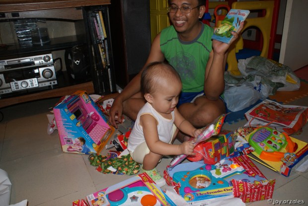 The first gift was from Nanay and Tatay. It took her so many minutes before she finally opened the gift. And after that, yun na lang ang nilaro niya kasi computer. Hindi pinansin yung iba pa niyang bubuksan. But we convinced her to open her other gifts. She received a lot of toys (well, a lot came from me and dann :)). When had opened almost all of her gifts, she didn’t know what to do. She wanted to play all of them at the same time. She even became a one-woman band because of her musical toys. But she enjoyed all of her gifts.