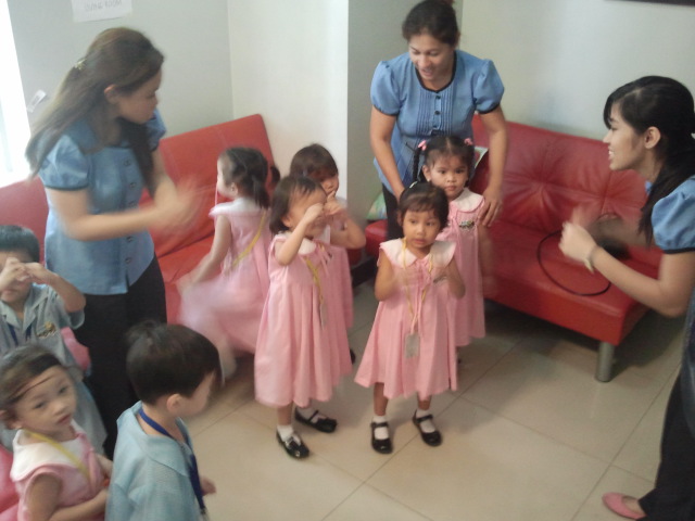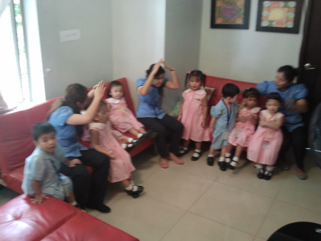 The one beside Ria, the small curly girl in front is Nikki, Ria’s “bestfriend” It was because Nikki had a hard time adjusting to the school environment so she needed to have a companion she knows inside the room. It was just two weeks before they visited our house that Nikki got to adjust. During the times that Nikki was crying, the teachers asked Ria to sit beside her since Ria did not experience separation anxiety. So they thought it would influence Nikki to be confident. So Ria sat beside her, put her arms around Nikki and even wiped Nikki’s tears. T. Janette said whenever a classmate is crying, they will let Ria sit beside him/her so Ria could comfort that kid. They also said that Ria is the most mature among the class. That she shows care to whoever is seating beside her.
