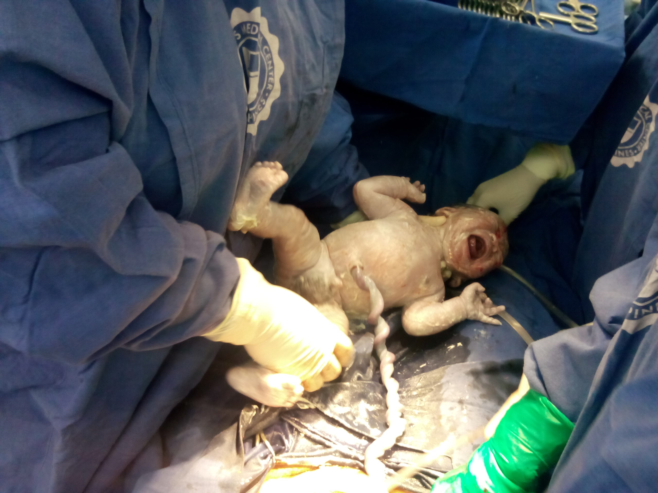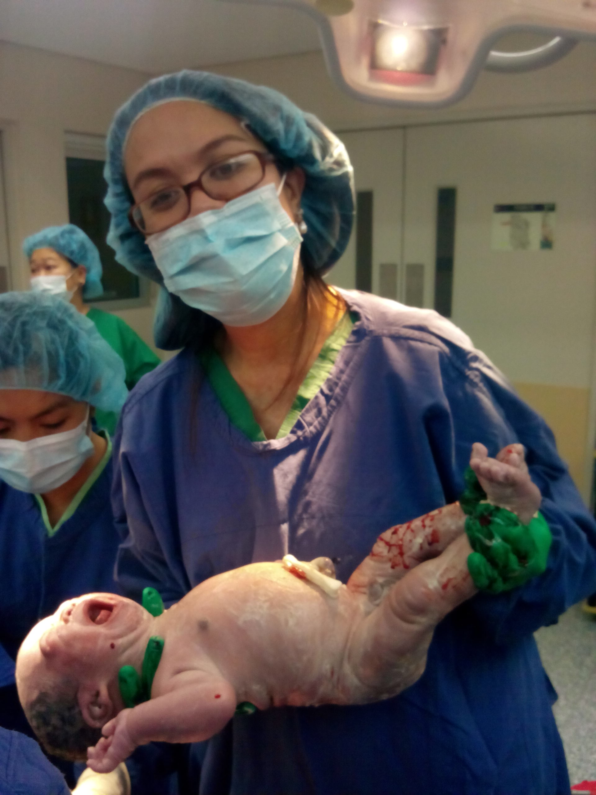 Then my OB started her work. I remember her asking someone “ok na yung ganitong kalaki no?” Haha. Just imagine me, staring somewhere just to entertain myself. I was staring left and right and on the lamp. Then after few minutes, she instructed the nurses to call my husband. So I know baby was about to be pulled out. Dann entered the room in suit and the anesthesiologist asked for the camera (our tablet) and started to take pictures. Dann went to my side and said “ayan na si baby” 🙂 Then I felt a heavy pressure on my chest area as Dra pulled baby from my tummy. Half way through (according to Dann), JJ started to cry. I was relieved.