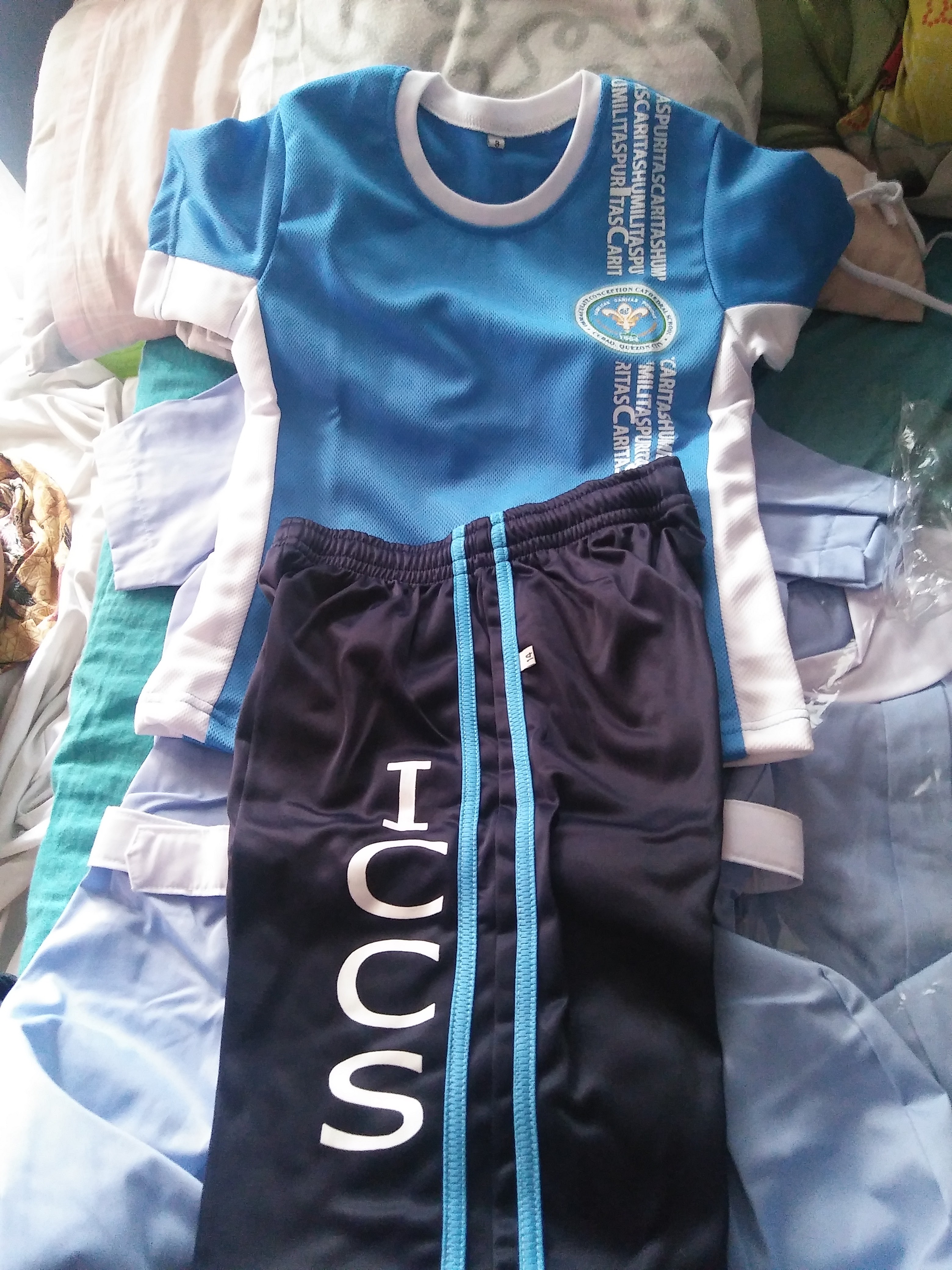 For the PE uniform, the shirt is a blue jersey and the jogging pants is a dark blue one. Jersey fabric is usually used for athletic wear and this one is a wicking jersey, meaning it will wick moisture out of the body.