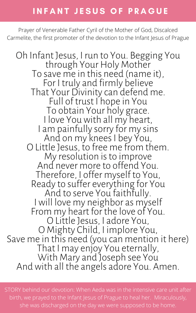 We also devoted ourselves to the Infant Jesus of Prague because we prayed to Him when Aeda was in the intensive care unit.