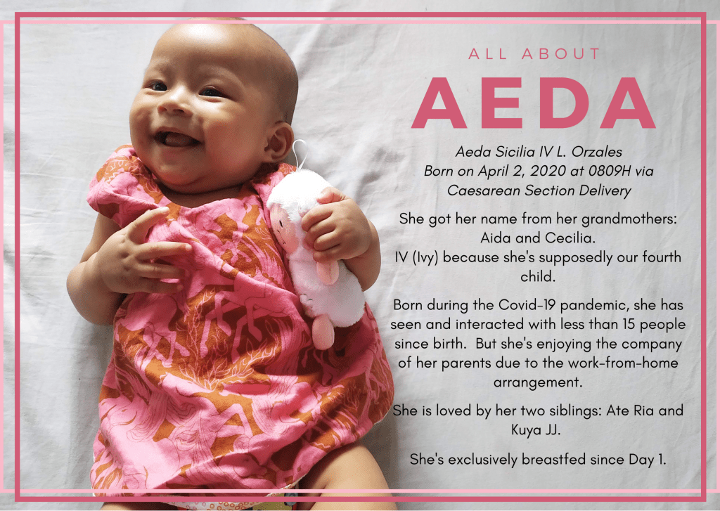 Aeda is our fourth child and a rainbow baby. Our supposedly third child is already in heaven with God, making them happy up there. She is exclusively breastfed since Day 1 and uses cloth diapers as our way of helping conserve Mother Earth.